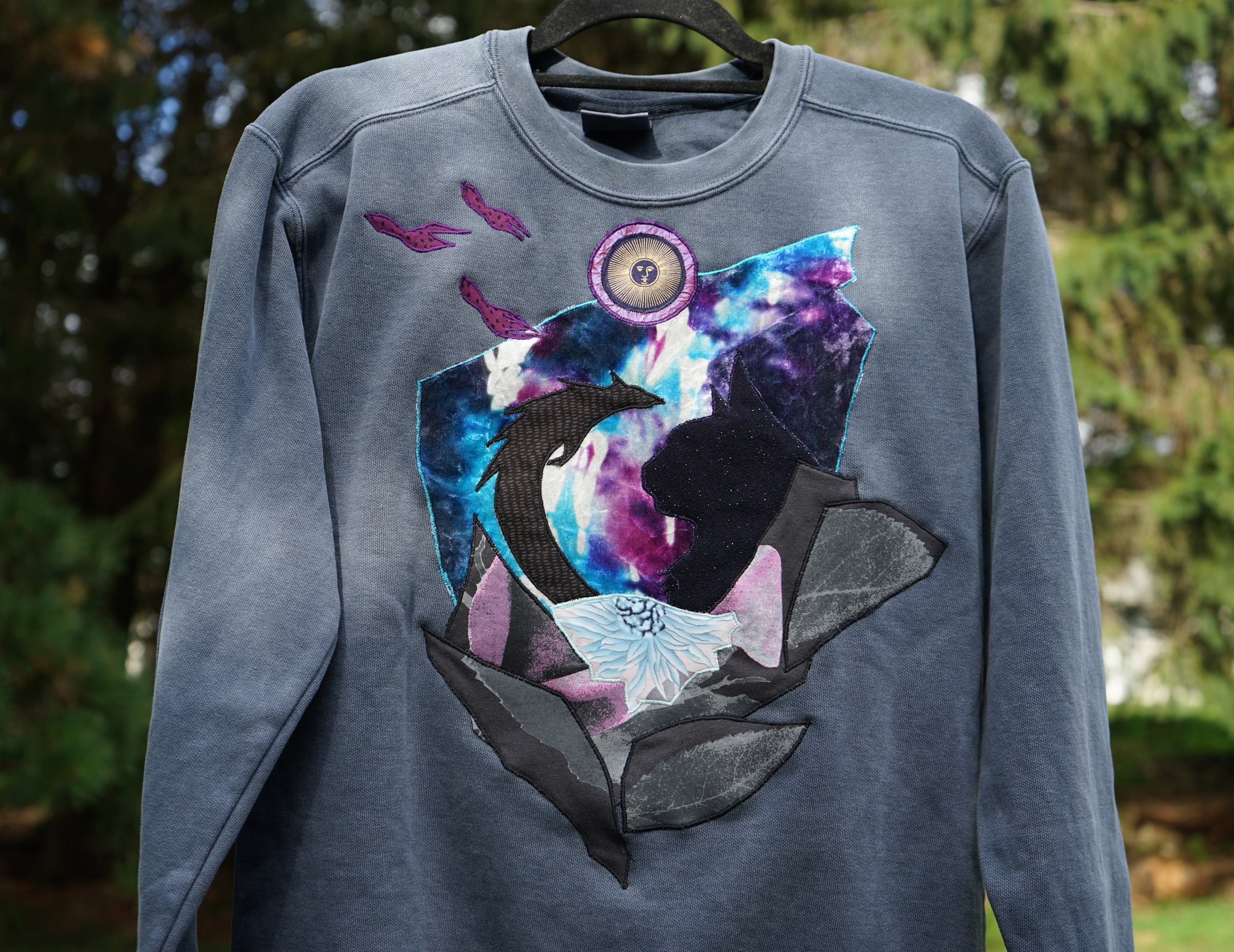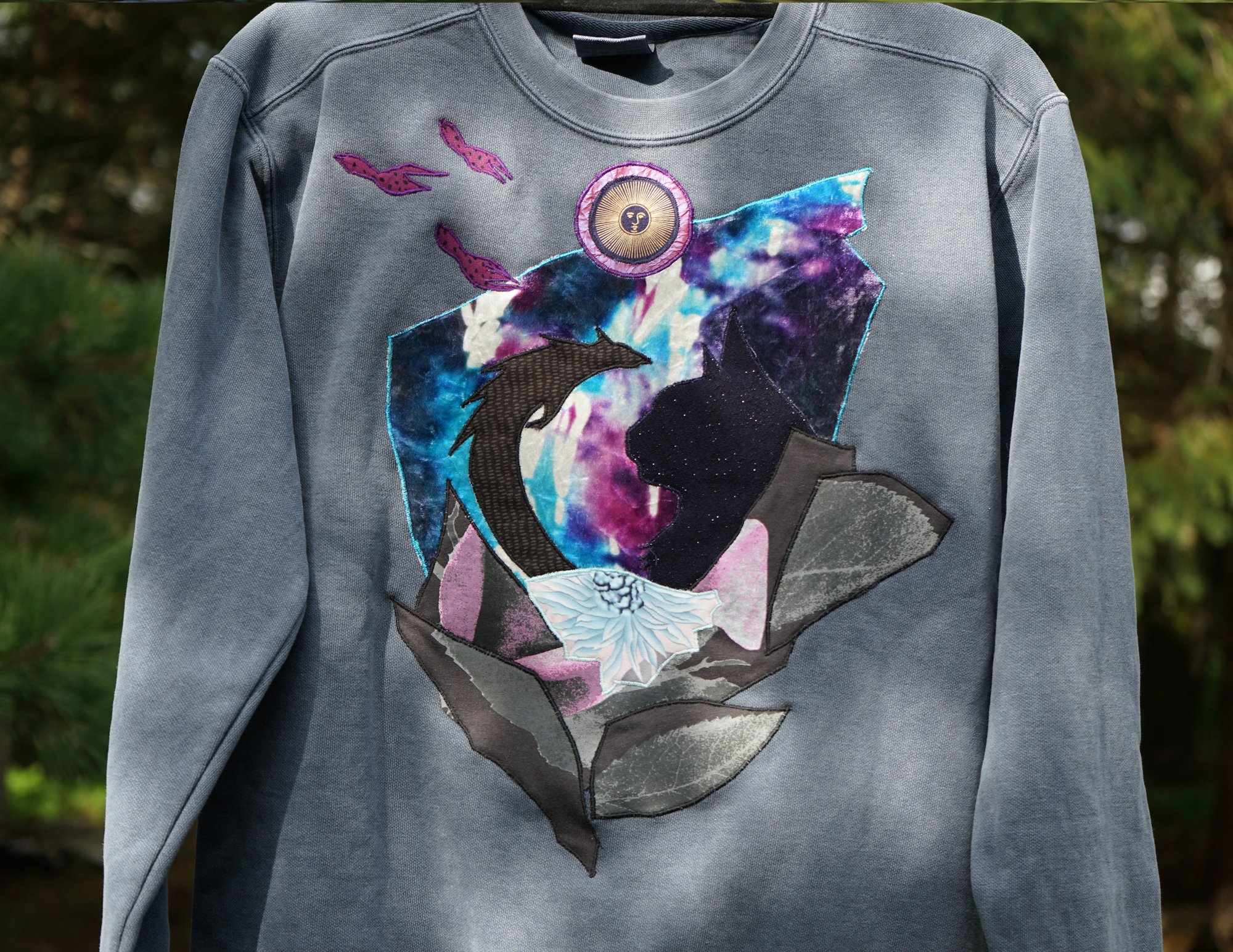 This one-of-a-kind upcycled collage sweatshirt blends mythical creatures, celestial storytelling, and textile art.
