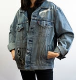 The jacket itself is a new Levi's mall closeout, customer return. It's men's size Large but will go with any gender. ONE OF A KIND, IMPOSSIBLE TO REPEAT.