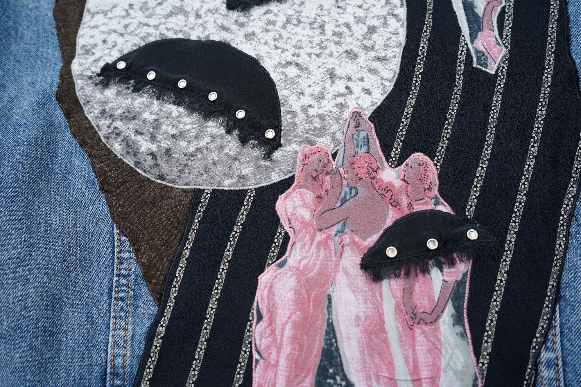 A truly alluring design,rich with details and meanings. The Three Graces and some other images come from a blouse that laid forgotten in my mom's closet for over 30 years, oblivious to its potential. Now they have gotten a second life in an eery, unforgettable composition. Notice all the hidden details all over.