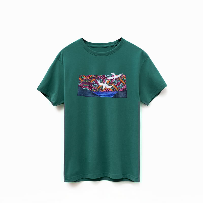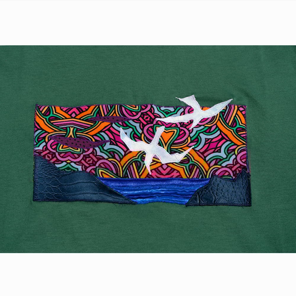 Crafted from ultra-soft organic Supima cotton, this one-of-a-kind tee captures a vivid moment of motion and color—two birds in mid-dive against a swirling, psychedelic sky. Hand-sewn from upcycled textiles, it’s a wearable piece of art for lovers of nature, color, and slow fashion. Lightweight, breathable, and bold—made to move with you.