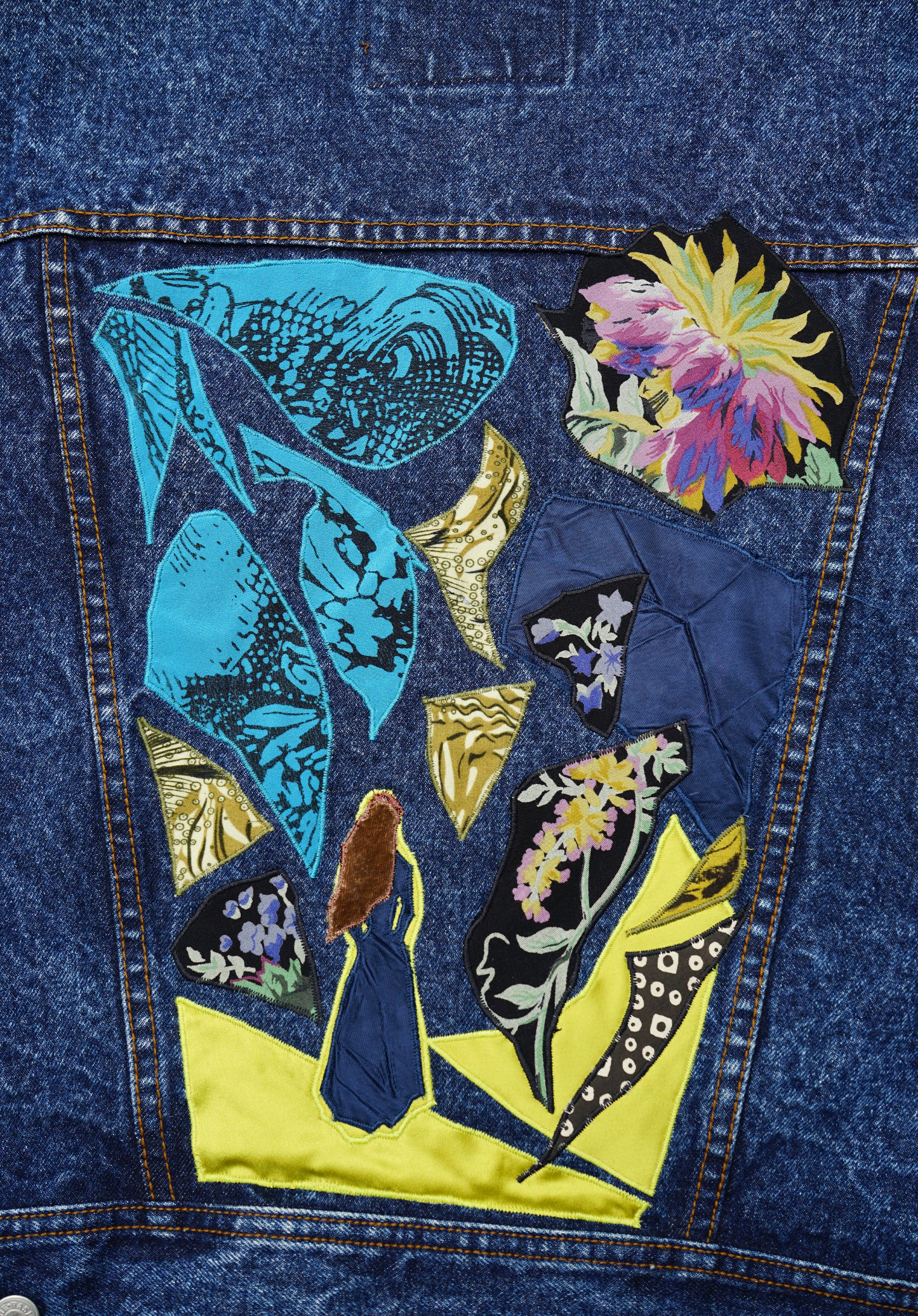 Crafted with a vintage Jordache jacket, this unique piece is embellished with a captivating fabric collage. The materials are upcycled from renowned fashion houses, infusing each stitch with a touch of poetry and elegance.