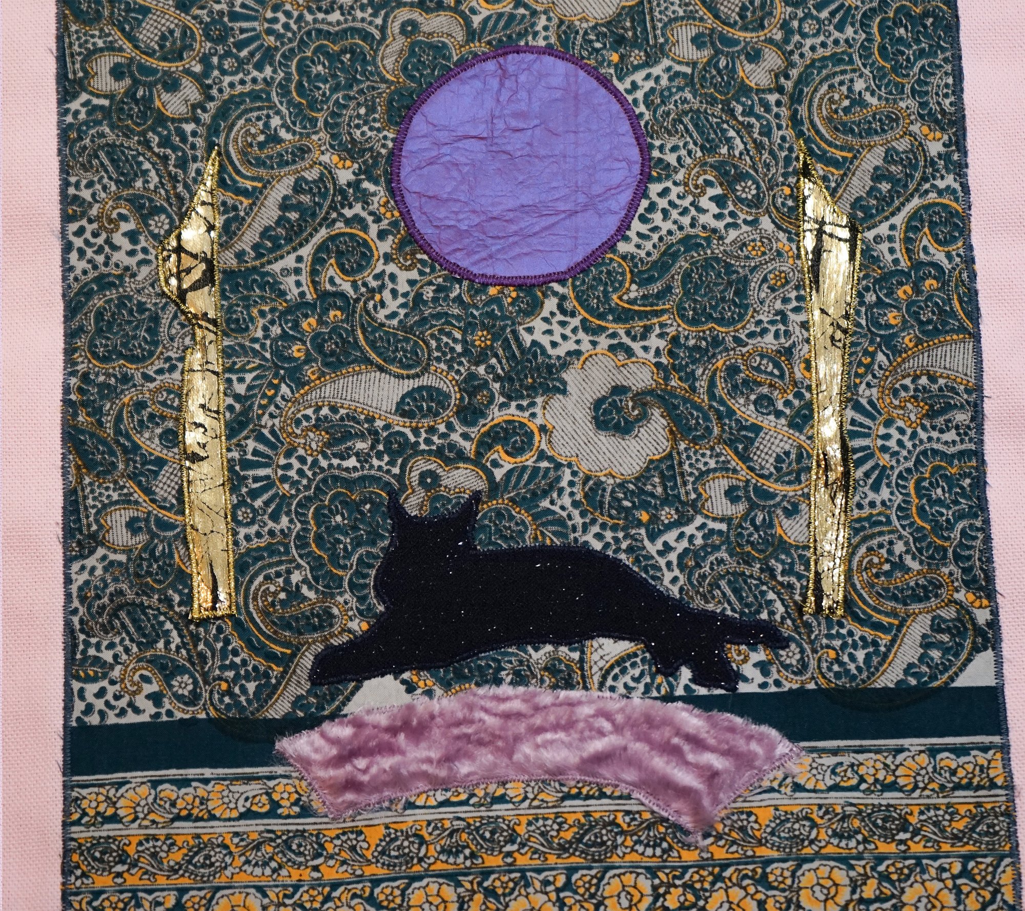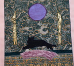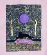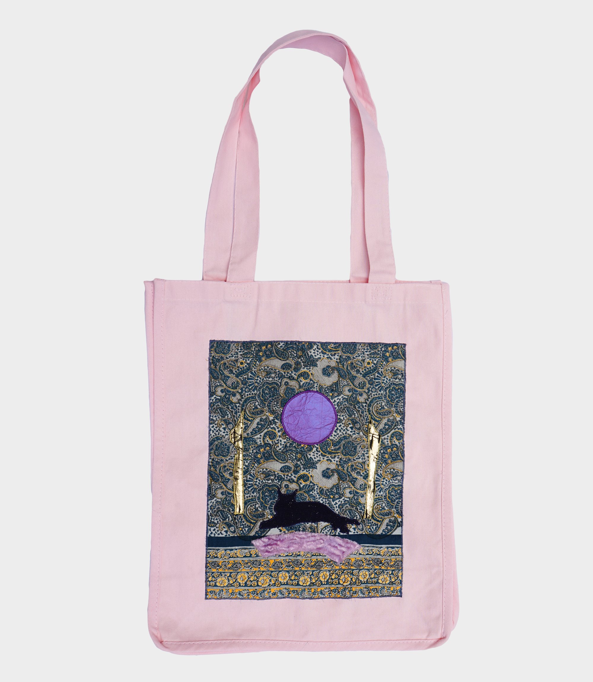 Make a statement with this one-of-a-kind art tote. Crafted on a new cotton base and featuring a handmade upcycled fabric collage, this piece blends slow fashion, sustainability, and surreal beauty. The reclining black panther under a purple moon evokes bold softness for eco-conscious queens and creative souls.