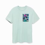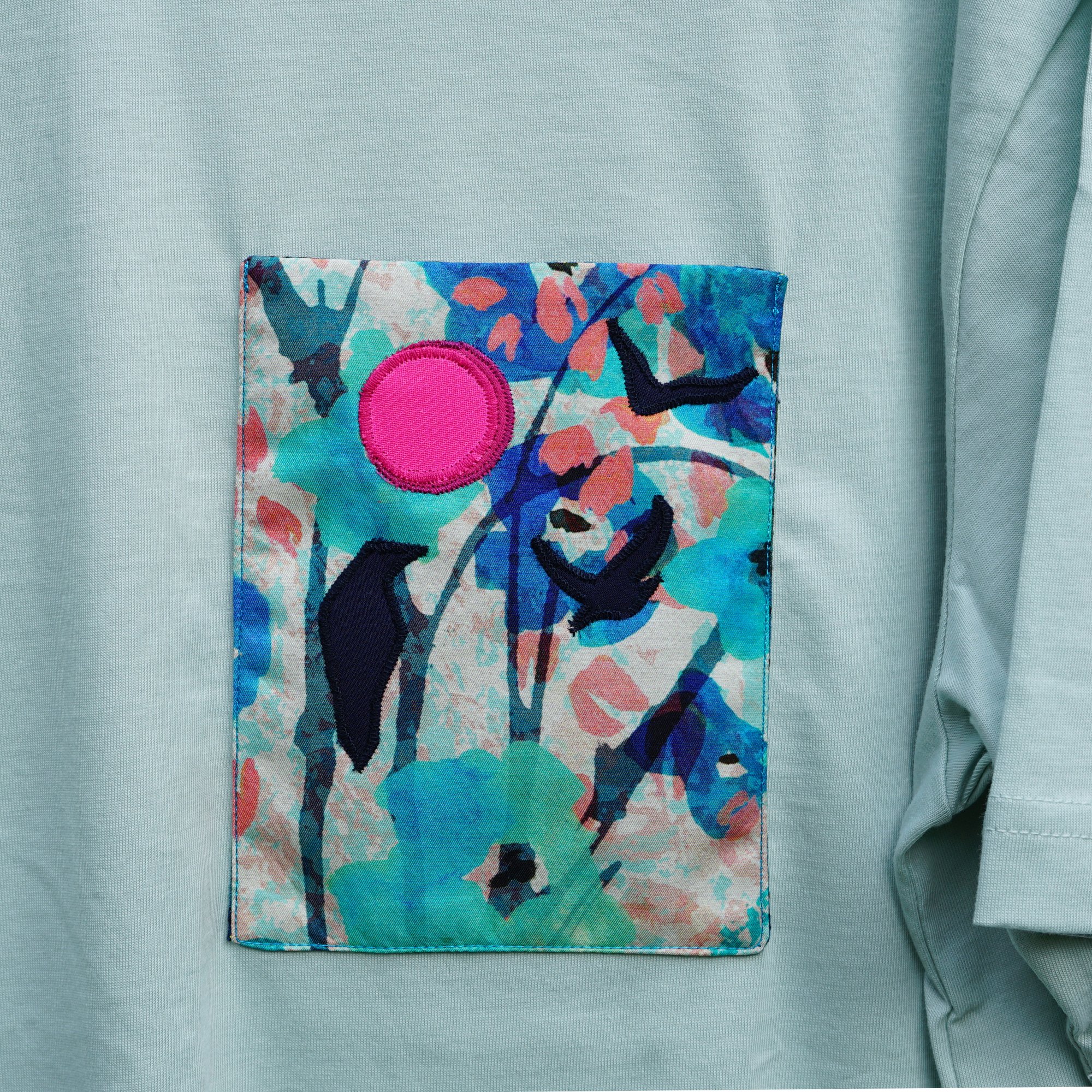 Soft, surreal, and sustainably made, The Blush Sun is a wearable moment of stillness and light. Crafted from premium Supima® organic cotton, this seafoam tee features an upcycled fabric collage of a dark bird beneath a floral sky and soft pink sun — no two alike.