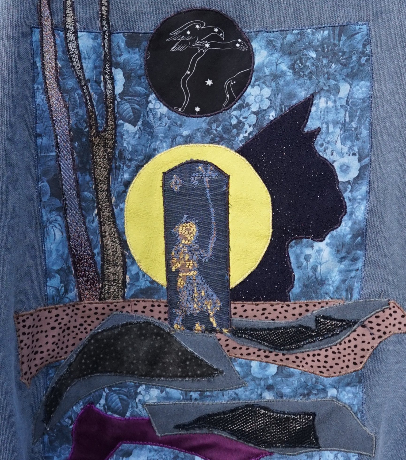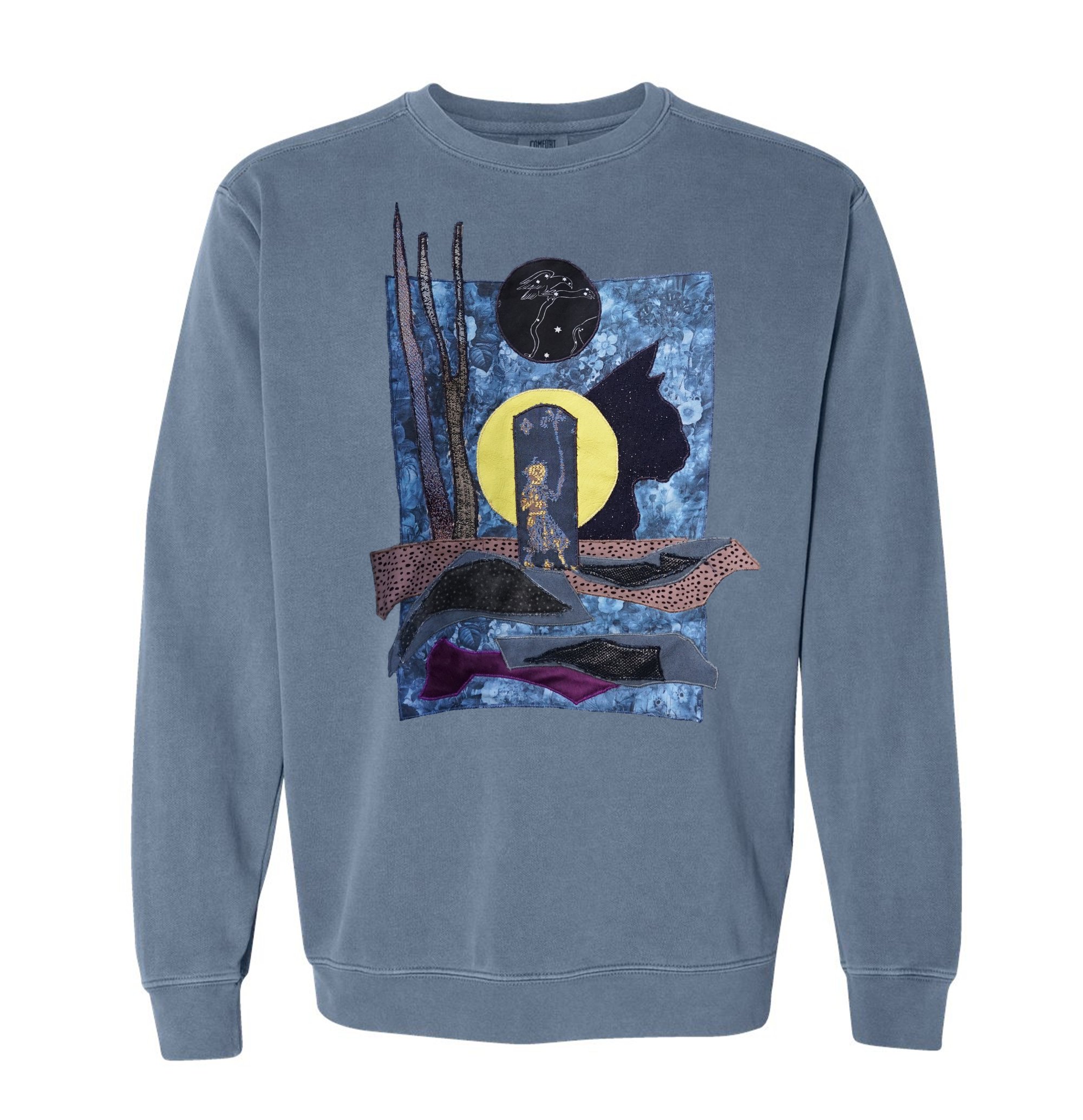 A one-of-a-kind collage sweatshirt evoking quiet strength and inner vision.